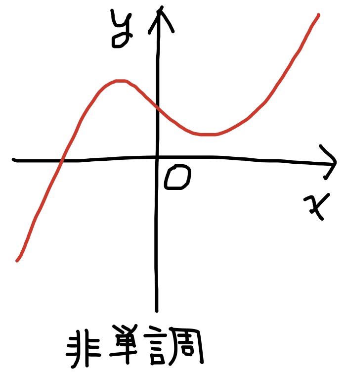 定義(p53) 関数$y=f(x)$が単調増加であるとは, グラフが右上がりであることを言う. 言い換えると, 独立変数$x$の値が増えると従属変数$y=f(x)$の値も増えることを言う. 逆に, グラフが右下がり,つまり, $x$が増えると$y=f(x)$が減るような関数は単調減少という. 単調増加と単調減少を合わせて, 単に, $$単調$$ という. $$単調増加 = グラフが右上がり = xが増えるとyも増える$$ $$単調減少 = グラフが右下がり = xが増えるとyは減る$$